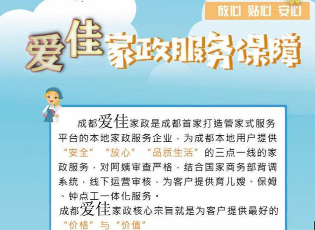 成都爱佳家政是成都极力打造管家式服务平台的本地家政服务企业,为成都本地用户提供“安全” “放心”